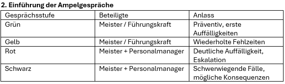 Die Eskalationslogik der Ampelgespräche erinnert an ein Sanktionssystem. Die Einbindung des Personalmanagements ab der roten Stufe signalisiert eine Verlagerung vom Fürsorge- zum Disziplinaransatz. Wir fordern, dass jede Gesprächsstufe freiwillig bleibt und ohne Druck geführt wird – mit klarer Einbindung des Betriebsrats auf Wunsch der Beschäftigten.