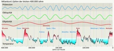 Bei den Milanković-Zyklen handelt es sich um langperiodische Veränderungen der globalen Verteilung der auf der Erde eintreffenden Sonnenstrahlung über die jährliche Schwankungsbreite hinaus. Die Erdbahn um die Sonne, die Präzession der Erdrotationsachse sowie die Neigung der Erdachse und damit die wechselnden Einfallswinkel der Sonneneinstrahlung auf der Nord- und Südhemisphäre unterliegen dabei verschiedenen Orbitalzeitskalen.