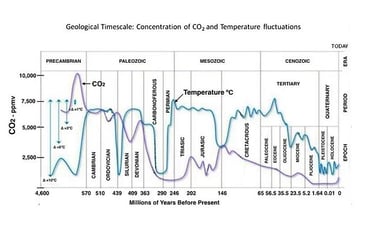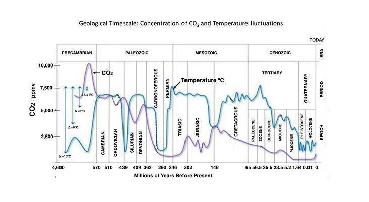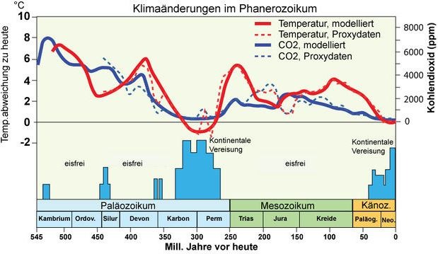 Wenn man sich folgendes Diagramm anschaut, hatten wir bereits die zehnfache Menge CO2 in der Atmosphäre und dabei ähnliche Temperaturen wie heute. Wir hatten aber auch schon mal ähnlich viel CO2 in der Atmosphäre wie heute und deutlich wärmere Temperaturen. Wie kann das sein?