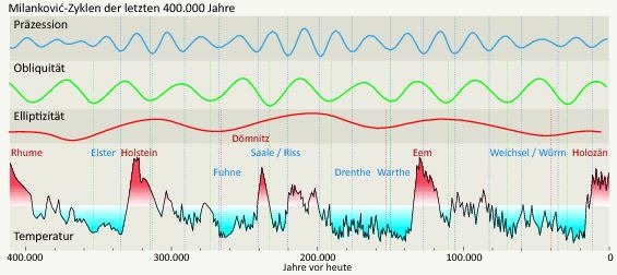 Als Hauptursache für den regelmäßigen Wechsel der Kalt- und Warmzeiten im Quartär (begann vor 2,6 Millionen Jahren), dem jüngsten Zeitabschnitt der Erdgeschichte einschließlich des Holozäns (begann vor 11.700 Jahren), gilt die sich periodisch verändernde Sonneneinstrahlung auf das Erdsystem auf Grund der Milanković-Zyklen.