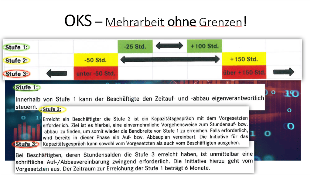 Seit Beginn dieses Jahres, bemängeln die zuständigen Betriebsräte in der OKS, den Umgang mit Mehrarbeit. Wir haben da klare Regelungen und Leitplanken, es nimmt aber langsam Überhand, wie diese verbogen werden.