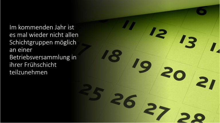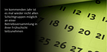 Der Anspruch, welcher uns regelmäßig zugetragen wird, die Betriebsversammlungen gleichmäßig auf die drei Hauptschichtgruppen aufzuteilen, damit jede Schicht wenigstens 1x im Jahr, eine Betriebsversammlung, in der jeweiligen Frühschicht hat, kann man scheinbar, nun nicht mal mehr, mit langer Vorlaufzeit gerecht werden. So wird im nächsten Jahr eine Schichtgruppe an zwei und eine Schichtgruppe an einer Betriebsversammlung teilnehmen können. Die dritte Schicht, fällt mal wieder hinten runter. Ich bin der Meinung, da läuft die Priorisierung falsch, aber das wird Jörg sicherlich gleich klarstellen, dass ich an diesem Punkt irre.