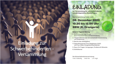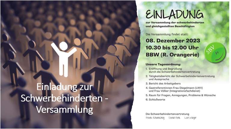 Fast am Ende meines Redebeitrags angekommen, möchte ich noch etwas positives berichten. Ich freue mich sehr, dass wir der Schwerbehindertenvertretung neues Leben einhauchen konnten. Wir laden alle Schwerbehinderten und Gleichgestellten, für diesen Freitag zur SBV-Versammlung, im Raum Orangerie in der Ausbildungswerkstatt ein. Los geht es, um 10:30 Uhr und wir haben neben der Geschäftsleitung, noch zwei externe Gäste vom Integrationsamt und vom Integrationsfachdienst geladen. Wir bitten euch die Möglichkeit wahrzunehmen, damit wir euch die aktuellen Änderungen und Neuerungen bezüglich Schwerbehinderung vorstellen können. Die Sitzung ist bis 12:00 Uhr anberaumt. Bitte informiert eure Führungskräfte zeitnah, damit Ihr Zahlreich teilnehmen könnt.