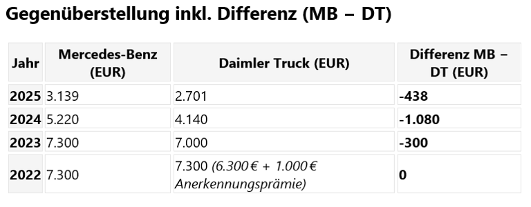 In der vergangenen Woche, kurz nach der Betriebsratswahl wurden wir vom Gesamtbetriebsrat über die Höhe der Ergebnisbeteiligung für 2025 informiert. 2.701€ gibt es für das vergangene Geschäftsjahr und somit 438€ weniger als beim PKW. Trotz bestehender Vereinbarungen in beiden Konzernen, die Gewinnbeteiligung bis einschließlich 2025 in identischer Höhe auszuzahlen, wurde diese Regelung wie erwartet, nicht eingehalten.