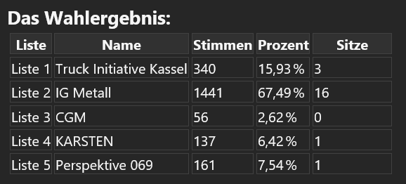 Wir als Truck Initiative, könnten nach der Wahl eigentlich zufrieden sein. Der Umstand, dass wir aus den Reihen der Minderheitengruppierungen, 2 Kollegen verloren haben, schwächt uns jedoch ungemein. Die wohl einschneidendste Auswirkung, ist der Verlust der paritätischen Kommission Entgelt, für welche wir 3 Jahre gekämpft haben. Und nun, wegen des neuen Kräfteverhältnis im Betriebsrat, leider wieder verloren haben. Das einzig Positive, was wir in den Vordergrund stellen können, ist, dass wir die einzige Gruppierung hier im Werk sind, welche prozentual und absolut bei dieser Wahl zulegen konnte. Umso mehr ärgert es uns, dass wir kein weiteres Mandat erreichen konnten.